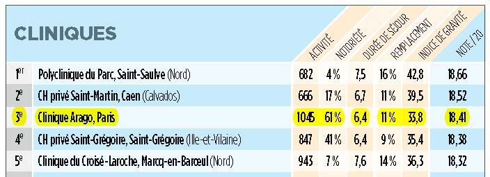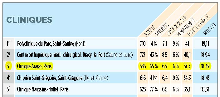 Une fois de plus la Clinique Arago est au sommet du classement des Cliniques et des Hôpitaux de France 2015 du magazine Le Point dans ses domaines hyper-spécialisation la mise en place de Prothèse totale de hanche et de Genou.