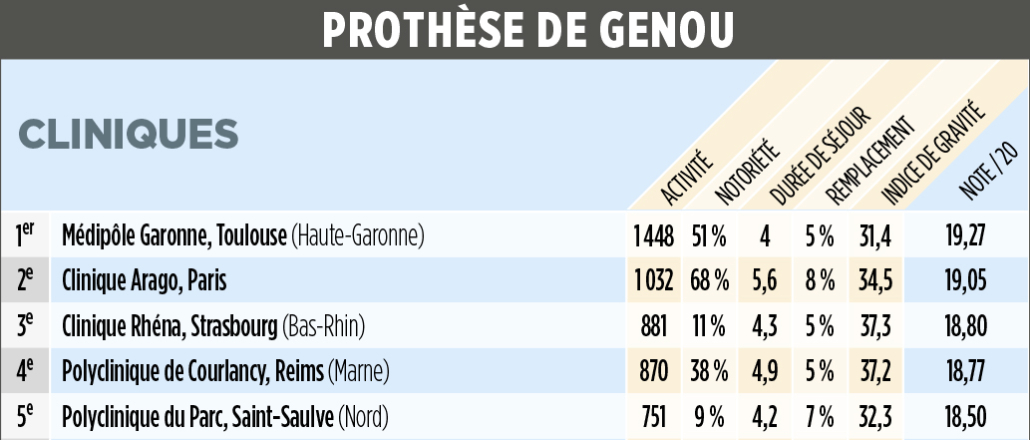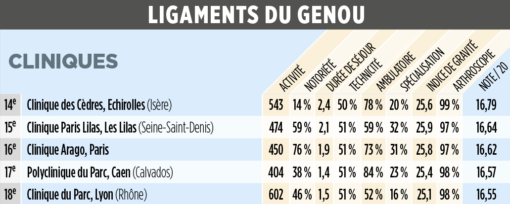 Pour la première fois, la clinique s’immisce dans le classement de la chirurgie du ligament du genou (LCA, ménisque) directement à la 16e place.