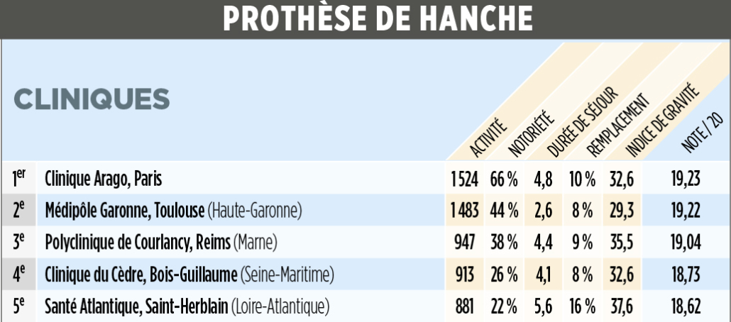 Félicitations a l’ensemble des équipes médicales et paramédicales de la Clinique Arago à Paris (Groupe Almaviva). Malgré le contexte pandémique internationale depuis le début d’année, la clinique est toujours dans le tableau d’honneur des Meilleures Cliniques de France dans ses domaines de prédilections : la Prothèse totale de Hanche (PTH) et la Prothèse totale de Genou (PTG).